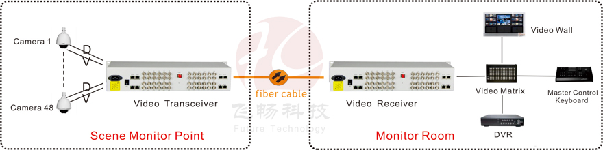 This digital video optical transceiver adopts digital video encoding and gigabit optical fiber transmission technology. The multi-channel single-direction bi-direction audio, video, data, telephone, Ethernet and switch real-time synchronization, no-distortion and high quality transmission is on the single-core or dual-core optical fiber. Complete digital video non-compression transmission technology, with video and data condition indicator, can monitor the system normal operation. It uses modular design, the user can flexibly select or customize configuration based on the scene occasion. Rack installation or desktop installation can be optional. This product is made up of optical transmitter and receiver. It can transmit 48Channel forward direction Video and 1Channel reverse direction RS485 data.