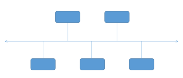 總線拓?fù)浣Y(jié)構(gòu)是將網(wǎng)絡(luò)中的各個節(jié)點(diǎn)設(shè)備用“一根總線”連接起來,實現(xiàn)計算機(jī)網(wǎng)絡(luò)的功能。任何連接在總線上的設(shè)備都能在總線上發(fā)信號,并且所有設(shè)備都能接收信號??偩€型拓?fù)浣Y(jié)構(gòu)圖如下: