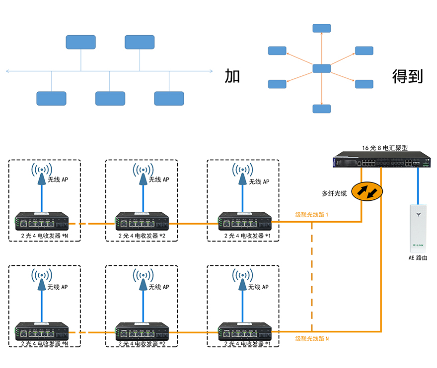 例如上圖:是多條總線結(jié)構(gòu)(手拉手級聯(lián))連接到一臺匯聚交換機(jī),組合成更大的復(fù)合型網(wǎng)絡(luò)。