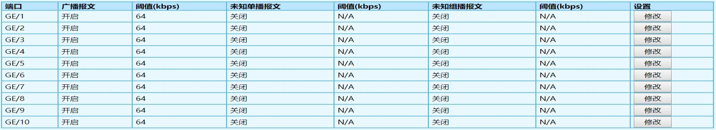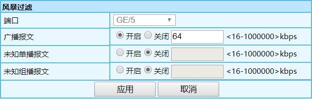 選擇是否開啟對廣播報文的速率抑制??赏ㄟ^單選按鈕進行選擇。 開啟 --如果選擇開啟,則要輸入相應(yīng)的速率抑制值,<16-1000000>,歩 進為 16,單位為 kbps 關(guān)閉 |