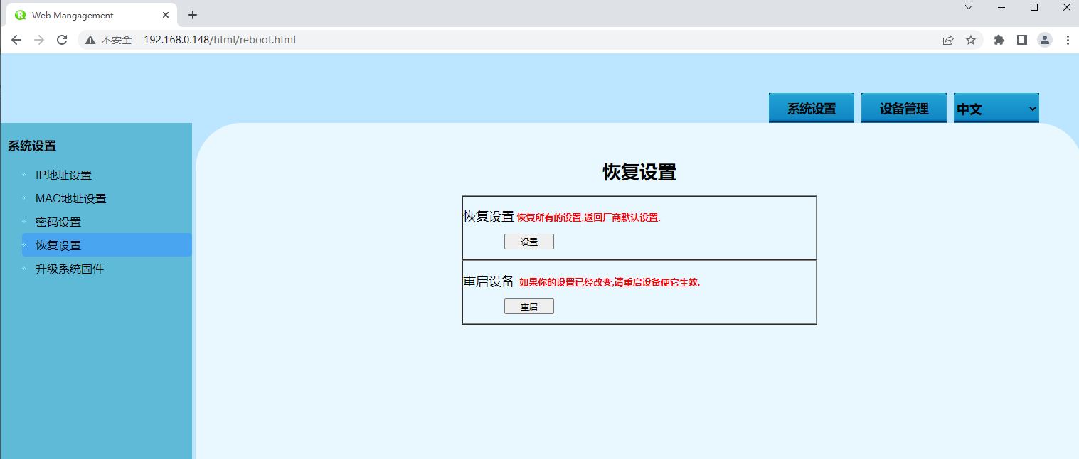 | 恢復(fù)出廠設(shè)置 | 單擊此按鈕,設(shè)備將失去所有現(xiàn)有配置,恢復(fù)為出廠配置。 |