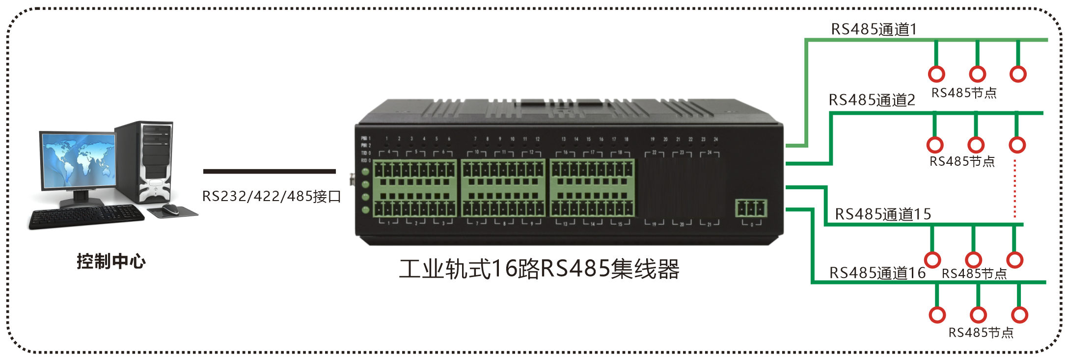 | 業(yè)務(wù)端口描述 | 16路RS485通道,1路上聯(lián)RS232/422/485(可選)接口 |