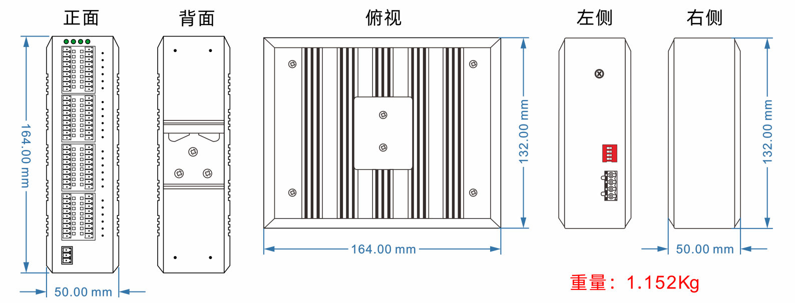 外殼:IP40防護(hù)等級,鋁合金材質(zhì) 尺寸:164mm(長) x 132mm(寬) x 50mm(高) 安裝方式:導(dǎo)軌安裝、壁掛式安裝 |