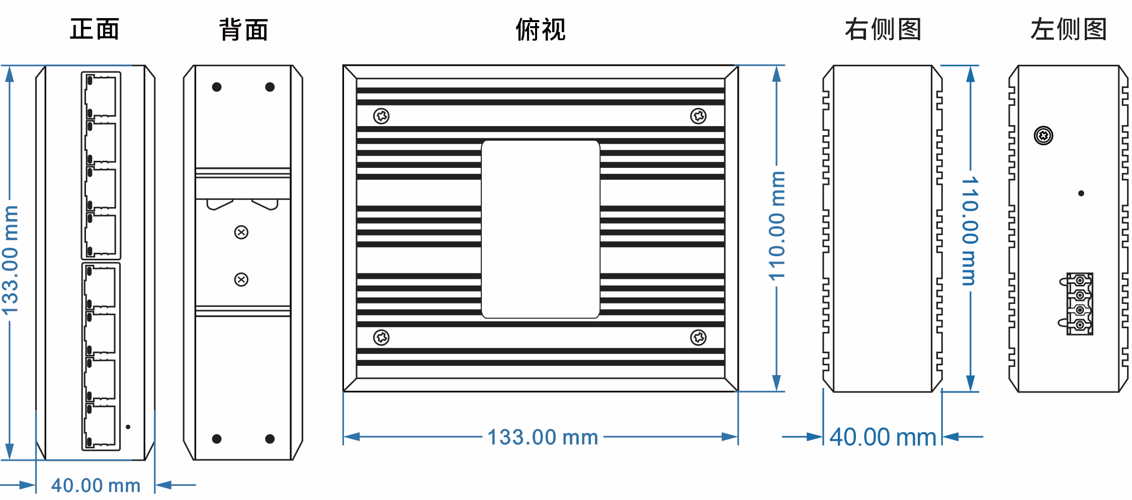 133mm(長) x 120mm(寬) x 41mm(高) 安裝方式:導軌安裝、壁掛式安裝 |