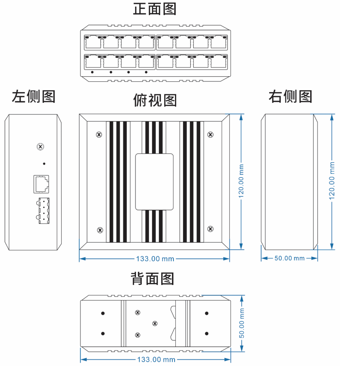(110mm(長) x 86mm(寬) x 50mm(高) 安裝方式:導軌安裝、壁掛式安裝 |
