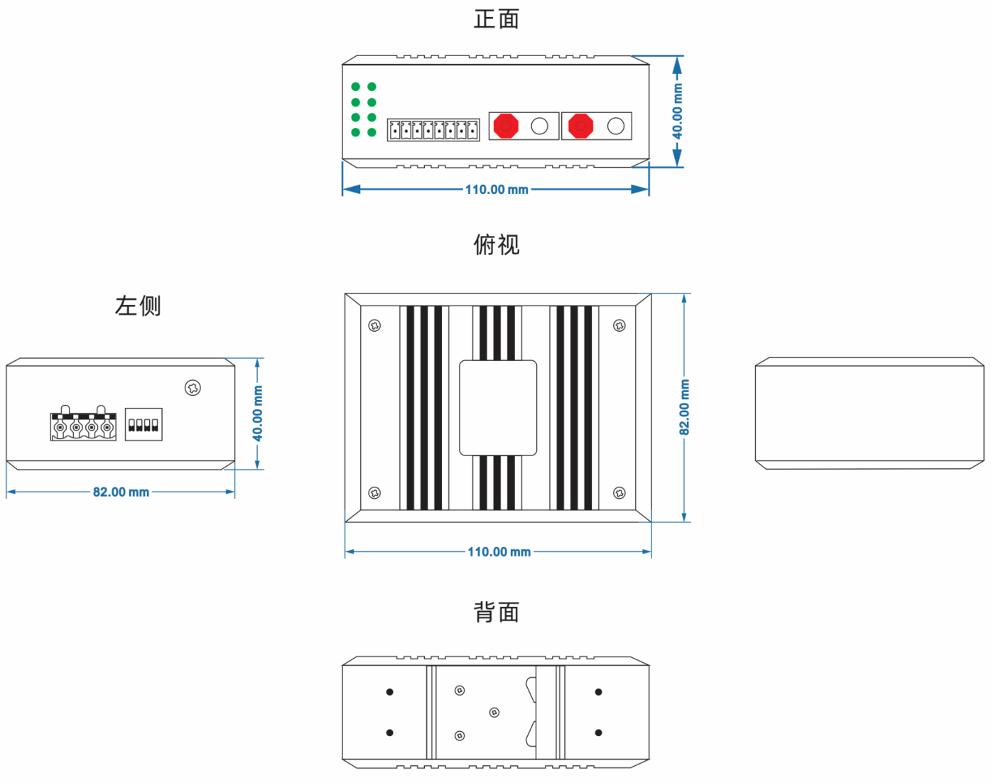 (110mm(長) x 86mm(寬) x 40.5mm(高) 安裝方式:導軌安裝、壁掛式安裝 |